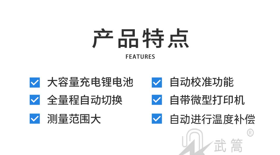 量程自動切換功能、 鹽密測量范圍大、自動進(jìn)行溫度補(bǔ)償、儲存和打印功能、大容量充電鋰電池、自動帶電修正系數(shù)等。